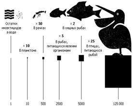 Систематическое применение пестицидов является прямым воздействием на биоценозы и ведет к частичному уничтожению насекомых-опылителей, муравьев, отрицательно влияет на рыб, водных беспозвоночных и птиц, наблюдается побочное влияние на животных и человека. Возрастает вероятность отдаленных последствий, связанных с патологическим и генетическим действием ряда препаратов на биоту. Остаточные количества пестицидов аккумулируются и биоконцентрируются в пищевых (трофических) цепях рис. В процессе биоаккумуляции происходит многократное (до сотен тысяч раз) повышение концентрации пестицида по мере продвижения его по пищевым цепям. Рис.