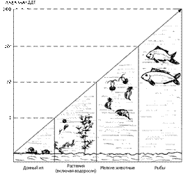 | Накопление токсикантов в водной пищевой цепи | Тысячекратное повышение концентрации ДДТ в пищевой цепи |