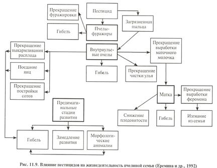 Наблюдения за пчелами показывают, что их потери очень значительны. Причем доказано, что гибель насекомых резко возросла не только из-за непосредственного отравления пестицидами, но и потому, что пчелы, прилетевшие с участков, на которых проводилась обработка химическими средствами, имели чуждый запах и изгонялись из ульев. Так, при авиаобработках посевов пестицидами погибает до 10-20% пчелиных семей, живущих на этих территориях. При обследовании погибших от пестицидов пчелиных семей было установлено, что гибнут в основном большие и крепкие семьи, так как для создания больших запасов меда на холодное время года пчелам необходимо «посещать» большое количество растений и летать на большие расстояния. Несмотря на разнообразные меры по предотвращению отравления, потери от гибели и косвенного урона продолжают расти. При отравлении пчел наиболее общим симптомом является появление в улье больных и мертвых особей. Но кроме смертности при отравлении обычный симптом — агрессивность. Когда пчелы гибнут, рабочие особи почти всегда становятся «кусачимы». При содержании пчелиных семей на кормах, собранных с обработанных медоносных культур, как правило, наблюдается хроническое отравление пчел, ведущее к резкому ослаблению силы семей и к повышенной восприимчивости к различным болезням. При естественном заносе пчелами в мед с обработанных цветущих медоносов, например, донника, он сохраняется в меде более десяти месяцев хранения независимо от температуры.