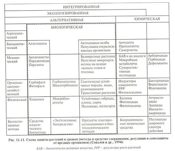 В качестве альтернативы чрезмерной химизации сельского хозяйства широко внедряется интегрированная защита растений рис. 11.11. В интегрированной защите растений регуляторами являются конкретные методы борьбы с вредными организмами: применение пестицидов, интродукция в систему паразитов, хищников или патогенных организмов, стерилизация самцов, использование половых антррактантов и репеллентов, изменение условий среды выращивания растений, применение биологического метода защиты растений.