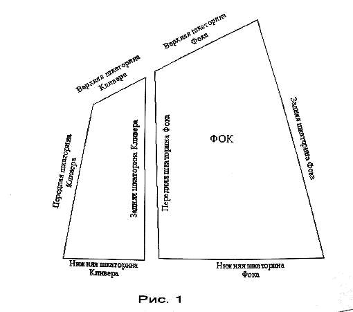 Шлюпка – это гребно-парусное плавсредство. Хотя в большинстве случаев для шлюпки вёсельная тяга является основной, нас интересуют паруса. Шестивёсельный ял имеет одномачтовое рейковое разрезное парусное вооружение, основными частями которого являются рангоут – мачта и реёк, паруса – кливер и фок, стоячий такелаж – снасти для поддержания рангоута (ванты, бакштаги), бегучий такелаж – снасти для подъёма и управления парусами (фал, шкоты, галсы). На ЯЛ-6 используются паруса в форме неправильных четырёх угольников, кливер площадью 5,8 кв. м и фок площадью 14,6 кв. м. Для обеспечения однозначности понимания, о чём идёт речь в парусном деле существует своя терминология. В этой связи свои наименования получили все четыре кромки парусных полотнищ и каждый угол обоих парусов. Кромка парусного полотнища называется шкаториной. Полное название кромки указывает на название паруса и положение данной кромки относительно носа или кормы и относительно верха или низа (рис.1).