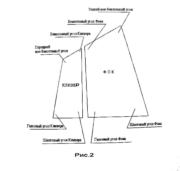 Название углов парусов определяется не только названием паруса и положением угла, но и часто названием элемента такелажа, крепящегося к этому углу и элементом рангоута, к которому крепится угол (рис.2).