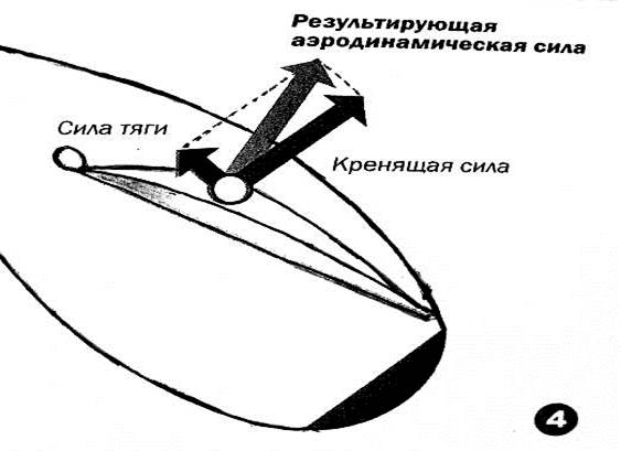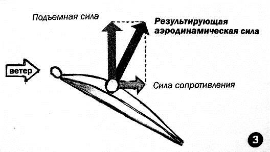 Результирующая аэродинамическая силапаруса образуется двумя основными составляющими: подъёмной силойи силой сопротивления. Рис.3. Подъёмная сила действует под прямым углом к ветру, а сила сопротивления – по ветру. С увеличением скорости ветра обе силы увеличиваются, но сила сопротивления растёт быстрее. Как следствие, для разных скоростей ветра есть различные формы парусов, имеющие оптимальные соотношения подъёмной силы к силе сопротивления.