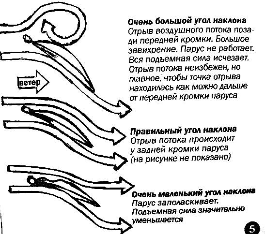 Чтобы устойчиво двигаться против ветра, требуется добиваться максимальной силы тяги, не допуская превышения кренящей силы определённых пределов.Эффективно работающий киль – основной фактор, определяющий способность лодки идти под углом к ветру. Рассмотрим, как правильно поставить паруса относительно направления ветра. Изначально поток воздуха должен быть почти параллелен передней кромке паруса, имея небольшой угол наклона к ней. При слишком большом угле наклона поток на подветренной стороне отрывается от паруса и в потоке возникают большие завихрения. Рис.5. Если точка отрыва переместится слишком далеко вперёд, то парус полностью утратит подъёмную силу – затормозится. Турбулентность воздуха уменьшит подъёмную силу и увеличит кренящую. Шлюпка быстро потеряет скорость. Такая ситуация возникает когда перебраны шкоты. Если шлюпка направлена слишком круто к ветру (очень маленький угол наклона), парус прогнётся внутрь и может начать колебаться в области передней шкаторины - заполощет. Тоже будет если шкоты не добраны.