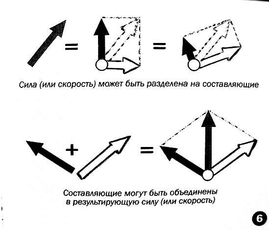 Если рулевой определился с курсом, то для правильной установки паруса, нужно ослабить шкот до начала заполаскивания, затем выбирать его снова до момента прекращения заполаскивания. Определить, что паруса заторможены (шкоты перебраны), сложно, поскольку внешний вид парусов при торможении не меняется. Перебранные паруса - распространённая ошибка у новичков. Можно утверждать, что паруса работают наиболее эффективно, когда они находятся на грани заполаскивания. Тренеру необходимо постоянно напоминать об этом начинающим рулевым. Понятие вымпельного ветра.На рис.6 показано, как любая сила может быть представлена двумя составляющими по правилу параллелограмма. И наоборот: две силы могут быть объединены врезультирующуюсилу. Соблюдая правило параллелограмма, вы можете разложить силу или скорость на составляющие в любой проекции и посмотреть, как данная сила действует в различных направлениях. Этот принцип действителен и для скоростей ветра.