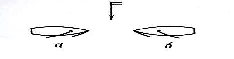 Рис.1. Влияние крена на управляемость шлюпки: а – крен отсутствует; б – крен на правый борт. Однако оно играет и отрицательную роль, когда для удержания шлюпки на заданном курсе приходится держать руль переложенным в сторону подветренного борта, что приводит к потере шлюпкой скорости. Кроме того, крен уменьшает остойчивость шлюпки и рабочую поверхность парусов. Следовательно, для сохранения остойчивости и достижения наибольшей скорости шлюпки необходимо уменьшать её крен. Небольшой крен бывает полезным при слабом ветре, когда парус не может принять правильную форму. В этом случае следует искусственно создать крен на подветренный борт; парус под действием собственного веса приобретает необходимую выгнутую форму. Парусное вооружение шлюпки рассчитывается так, чтобы центр парусности ЦП и центр бокового сопротивления ЦБС подводной части корпуса находились примерно на одной вертикали. Рис. 2,а.