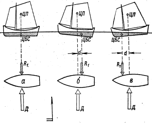 Влияние крена и дифферента на управление шлюпкойВ разделе «Аэродинамика» мы рассматривали как образуется результирующая аэродинамическая сила. Для простоты принято, что эта результирующая сила направлена по определённой прямой. Эта прямая пересекает парус в определённой точке – центре давления, или как принято называть среди яхтсменов центре парусности (Ц.П.). В большинстве опубликованных на эту тему материалов Ц.П. трактуется как постоянная точка, расположенная в геометрическом центре площади парусов. Таким же образом и силы сопротивления, возникающие в результате обтекания корпуса потоками воды, приложены в центрах лобового (ЦЛС) и бокового (ЦБС) сопротивления. Для обеспечения устойчивого прямолинейного движения шлюпки необходимо, чтобы силы направленные навстречу друг другу находились в одной вертикальной плоскости. Например, сила тяги Т и сила бокового сопротивления R, или сила дрейфа Д и сила бокового сопротивления R1. В силу конструктивных особенностей корпусов лодок и парусов допускается, что эти силы находятся примерно в одной вертикальной плоскости, когда лодка стоит на ровном киле, что не влечёт больших ошибок при конструировании и расчётах. Рис.1,а. Рис.2,а. В реальной обстановке на управление шлюпкой под парусами всегда оказывают влияние крен и дифферент. При крене от действия пары сил Т и R (силы тяги и силы лобового сопротивления подводной части корпуса шлюпки) с плечом К, которое значительно больше, чем при движении шлюпки на ровном киле, образуется вращательный момент вокруг вертикальной оси. Рис. 1,б. С увеличением крена за счёт увеличения плеча К этот момент возрастает и форштевень шлюпки поворачивается в сторону наветренного борта (на ветер). Явление, когда под угрозой опрокидывания шлюпка стремится привестись и, следовательно, обезветрить паруса, можно считать положительным.
