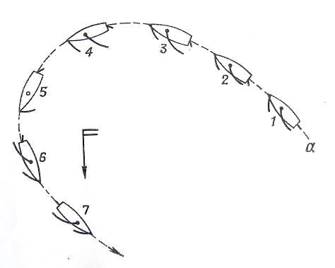 ПОВОРОТчерезФОРДЕВИНДПри повороте через фордевинд шлюпка пересекает линию ветра кормой. Поворот выполним всегда, но требует больше места, а во время свежего ветра не безопасен: при неумелом управлении шлюпка может перевернуться. Во время этого поворота шлюпка спускается под ветер, что крайне нежелательно при лавировке. Ниже рассматривается выполнение поворота через фордевинд для случая, когда шлюпка идёт в бейдевинд. Для шлюпки ЯЛ – 6 рисунок 2. Рулевой подаёт команду «К повороту» и затем – «Поворот через фордевинд», после чего кладёт руль достаточно резко в сторону поворота (2). Гребец, следящий за фалом, садится верхом на мачтовую банку лицом к мачте и парусу. Затем следуют команды: - как только корма шлюпки пойдёт на ветер – «Фок травить» (3); -- когда шлюпка увалится на линию галфвинда – «Кливер травить» (4); -- при подходе кормы к линии ветра (на 20—30 градусов) – «Фок к мачте» (5). Исполняя последнюю команду, гребец, следящий за фалом, встаёт на рыбины и, опираясь грудью на мачту, подбирает нижнюю шкаторину фока к мачте, уменьшая, таким образом, площадь паруса. Если этого не сделать, ветер может резко перебросить фок на противоположный борт и перевернуть шлюпку или сломать мачту.В тех случаях, когда шлюпка идёт в галфвинд или бакштаг, вместо первых двух команд подаётся одна – «Шкоты травить». При слабом ветре (до трёх баллов) разрешается фок к мачте не брать, но в этом случае при приближении кормы к линии ветра надо подать команду «»Фок стянуть» и, как только корма пересечёт линию ветра, немедленно травить фока шкоты на другой борт. Чтобы пересечение кормой линии ветра не получилось очень резким, руль нужно отводить плавно, а момент для завершения поворота выбрать с таким расчётом, чтобы большая волна не накрыла шлюпку с кормы. Когда корма пройдёт линию ветра и ветер перебросит фок на противоположный борт подаётся команда «Шкоты на правую (левую)» (6). Гребцы выбирают фока и кливершкоты в указанную сторону и пересаживаются на наветренный борт лицом к парусу. Гребец, следящий за фалом, опираясь на мачту и не выпуская, фока, быстро переходит на наветренный борт и постепенно травит фок, начиная от шкотового угла. Нельзя опускать фок сразу: если парус резко заберёт, шлюпка может опрокинуться. Когда паруса наполнятся и гребцы пересядут на наветренный борт, поворот считается оконченным (7) , гребец, работающий с фоком, возвращается на место. Написано капитаном первого ранга Хомяковым И.И.В том случае, если фок не удалось отдать постепенно, он резко перелетает на другой борт, шлюпка начинает резко приводиться на новом галсе. Если её не удержать это приведёт к опрокидыванию или аварии. Чтобы избежать этого, рулевой одновременно с переброской фока должен резко переложить руль на уваливание на новом галсе, сдерживая шлюпку от приведения. Если при этом шлюпка получит резкий крен на ветер, подаётся команда «Выбрать фок». Эти действия необходимо сделать очень быстро, счёт идёт на секунды. Опытные рулевые начинают уваливание одновременно с переброской фока, т.е. в тот момент, когда он ещё не забрал. Когда шлюпка разгонится можно переходить к другим маневрам необходимым в этой ситуации. Методика подготовки команды для выполнения поворота через фордевинд в сильный ветер.В силу ряда иногда и справедливых причин, о которых лучше не говорить, наши парусн