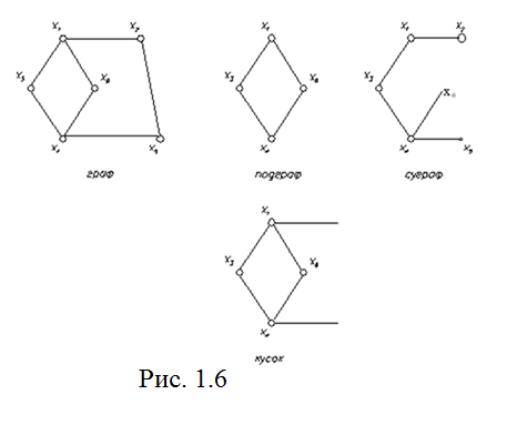 Объект Gi=(Xi,Ui), называется куском графа G=(X,U), если XiÍX, UiÍU, причемUi=UiiÈUij, где Uii-множество ребер соединяющих вершины из Xi между собой, а Uij - множество ребер, один конец которых принадлежит Xi, а второй X\Xi, т.е. Xi - подмножество X, а в Ui входят все ребра из U, инцидентные Xi.Другими словами, кусок графа G(Z,U) – это граф Q(X,Y), являющийся частью исходного графа такой, что X — подмножество Z, а в Y входят все ребра из U, инцидентные X.