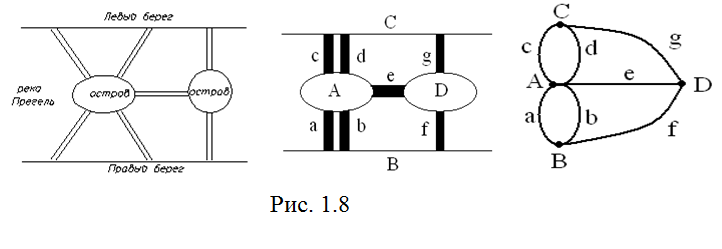 Задача возникла из следующего примера. В XIII веке жители Кенигсберга, прогуливаясь по мостам реки, Прегель пытались решить задачу: можно ли обойти все мосты, проходя по каждому из них только один раз (рис. 1.8)