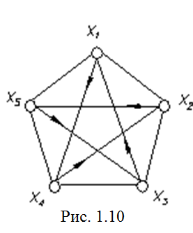 В полном графе с числом вершин n»2 всегда существует гамильтонов цикл. Пример такого цикла приведен на рис. 1.10 - (x1,x4) (x4,x2) (x2,x5) (x5,x3) (x3,x1).