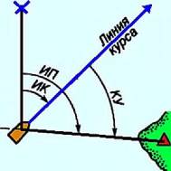 Курсовым углом КУ называется угол между носовой частью диаметральной плоскости судна и линией пеленга. В основном курсовые углы измеряют в полукруговой системе (от 00 до 1800) и им придают наименования, указывающие в сторону какого борта судна (правого или левого) вели счет. Например:: КУ= 10° л/б, КУ= 45° п/б.