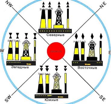 2. Кардинальные знаки служат для ограждения отдельно лежащих навигационных опасностей, а также затонувших судов. Эти знаки обозначают сторону (по компасу), с которой судно должно обходить опасность. Они могут выставляться в одном, нескольких или всех секторах от опасности. Для ограждения применяются буи и вехи черно-желтой окраски в различных сочетаниях (рис. 3.31).