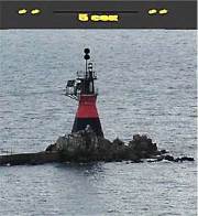 Западные буи и вехи выставляются в западном секторе к W от опасности. Знаки имеют желтый цвет с широкой черной горизонтальной полосой. Топовые фигуры - конусы вершинами вместе. Характер огня - Ч (9) 15с (девять частых проблесков в группе, период 15 с).