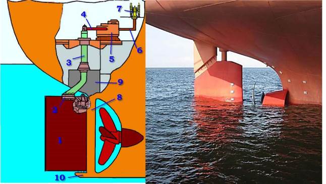 Дизель-генератор, расположенный в машинном отделении судна, вырабатывает электроэнергию, которая по кабельным соединениям передается на электромотор. Элетромотор, обеспечивающий вращение винта, расположен в специальной гондоле. Винт находится на горизонтальной оси, уменьшается количество механических передач. Винторулевая колонка имеет угол разворота до 3600, что значительно повышает управляемость судна.