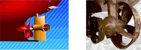 В последнее время получила распространение электродвижущаяся система AZIPOD (Azimuthing Electric Propulsion Drive), которая включает в себя дизель- генератор, электромотор и винт (рис. 6.6).