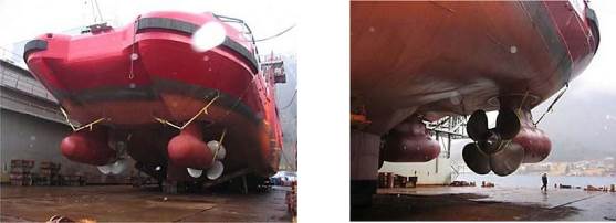 Один из примеров использования AZIPOD - танкер двойного действия (рис. 6.7), который на открытой воде двигается как обычное судно, а во льдах двигается кормой вперёд как ледокол. Для ледового плавания кормовая часть DAT оснащена ледовым подкреплением для ломки льда и AZIPOD.