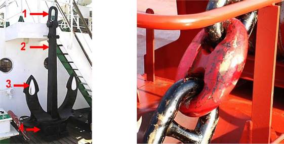 I - становой якорь; 2 - якорная скоба; 3 - вертлюг; 4 - якорная цепь; 5 - бортовой клюз;
