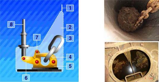Коренная смычка якорной цепи крепится в цепном ящике к корпусу при помощи специального устройства, имеющего привод на верхнюю палубу (рис. 6.16). Усилием, прилагаемым к рукоятке привода, освобождается откидной гак с заложенным за него концевым звеном, в результате чего якорная цепь полностью отдается.