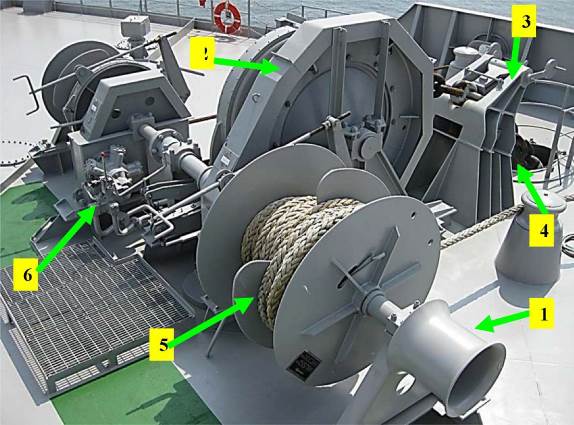 Рис. 6.22. Брашпиль со швартовной лебедкой: 1 - турачка; 2 - ленточный стопор; 3 - маятниковый стопор; 4 - палубный клюз; 5 - барабан со швартовным тросом; 6 - пульт управления брашпилем