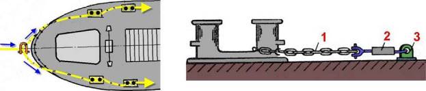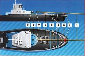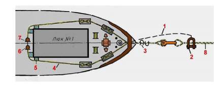 - Заранее готовят все необходимое для принятия и крепления «усов» на палубе судна, для чего через клюзы заводят стальные тросы-проводники со скобами, предназначенные для присоединения их к концам «усов», которые будут протаскиваться через клюзы на палубу.