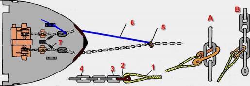 5 - соединение троса с цепью с помощью скобы (вариант А или В); 6 - стальной трос;