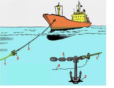 Рис. 6.55. Крепление буксирного троса к якорной цепи: 1 - буксирный трос; 2 - якорная скоба; 3 - удлиненное звено; 4 - якорная цепь;
