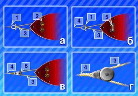 Рис. 6.62. Крепление буксирного троса на буксируемом судне: а) - два стропа пропущены через клюзы и соединены при помощи бревна; б) - огоны стропа соединены бензелем; в) - строп пропущен через блок Николаева; г) - блок Николаева 1 - якорная скоба; 2 - бревно; 3 - ветви стропа; 4 - буксирный трос; 5 - бензель