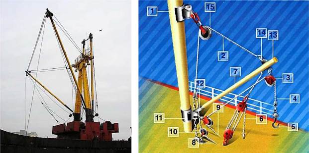 грузовой стопор и стальной трос - лопарь топенанта. Лопарь топенанта служит для подъема стрелы. Выбирают лопарь с помощью грузовой лебедки, на турачку которой заводят ходовой конец лопаря. Грузовым стопором стрелу закрепляют в нужном положении, для чего одно из звеньев цепи крепят к обуху, приваренному на палубе.
