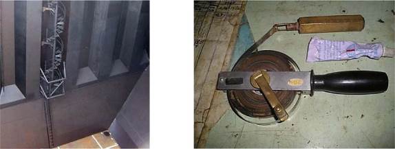Основой контроля над поступлением воды в корпус служат регулярные замеры уровня воды в льяльных колодцах отсеков. На судах, не оборудованных датчиками уровня воды, уровень воды в отсеках определяется вручную складным футштоком (или иным ручным измерительным инструментом, рис. 7.5) через специальные мерительные трубки, ведущие с верхней палубы в льяльные колодцы.