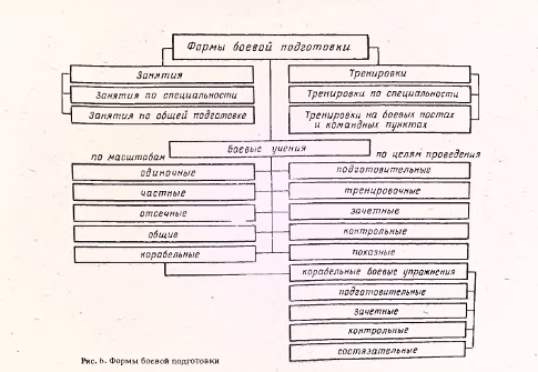 Формы боевой подготовки. Согласно ст. 41 Корабельного устава ВМФ СССР основными формами подготовки всех категорий личного состава корабля являются занятия, тренировки и боевые учения, а для офицерского состава, кроме того, самостоятельная подготовка, групповые упражнения и тактические летучки (рис. 6).