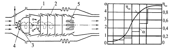 Коэффициент избытка воздуха весьма существенно изменяется по длине камеры сгорания ( Рис. 5.2 ), т. е. по мере возникновения, развития и завершения процесса сгорания топлива он возрастает по длине камеры сгорания.