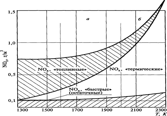 При температурах Т £ 2000 К в продуктах сгорания , как правило, присутствуют все три типа NOx; при температурах ³ 2000 К в основном образуются только «термические» оксиды азота в результате химических реакций между азотом и кислородом.