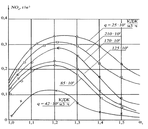 Максимальный выход оксидов азота имеет место при a = 1,2 – 1,3. По мере повышения теплового напряжения камеры сгорания q, содержание NOx повышается, а экстремум смещается в сторону больших значений a. При повышении величины a до 1,5 во всех случаях NOx в 1,5-3 раза ниже сравнительно с его максимальным значением при a = 1,2-1,3.