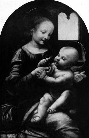 Не менее отчетливо элементы нового искусства выразились в произведении иного, более камерного характера — в «Мадонне Литта» (Ленинград, Эрмитаж). Эта небольшая картина создана, вероятно, в середине 1480-х гг. Общий замысел ее восходит, бесспорно, к самому мастеру, что подтверждается его собственноручным рисунком женской головы для головы мадонны, хранящимся в Лувре, и той особой красотой композиционного решения, которая в те годы была недоступна никому, кроме Леонардо. Однако живописное исполнение картины менее совершенно. Это связано, по-видимому, с тем, что л работе над ней принимал участие ученик Леонардо Амброджо де Предис.