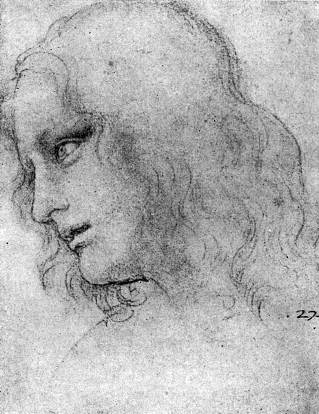 илл.131б Леонардо да Винчи. Голова апостола Филиппа. Рисунок для фрески «Тайная вечеря». Металлический штифт на грунтованной бумаге. 1495-1497 гг. Виндзор, Королевская библиотека.