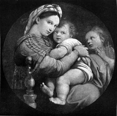 Еще более зрелый образец картины подобного типа дает «Мадонна делла седиа» («Мадонна в кресле», ок. 1516 г.; галлерея Питти). В этом произведении идеально-прекрасный характер образов соединяется с некоторыми подчеркнуто конкретными мотивами — например, на Марии мы видим яркий узорчатый платок с бахромой, какие в то время носили крестьянки в окрестностях Рима. «Мадонна в кресле» — это, пожалуй, вершина пластического стиля Рафаэля в его станковой живописи. Фигуры мадонны, младенца и маленького Иоанна тесно, без пауз заполняют круг, в который они вписаны. Крупные формы и объемы, как бы переплетаясь, переходят друг в друга; их энергичная пластика в сочетании со стягивающим их в одно целое круглым обрамлением сообщает этой лирической композиции оттенок своеобразной мощи. И сама тема материнства воплощена здесь более глубоко, нежели в прежних образах. Идея картины выражена не только в полных серьезности взглядах мадонны и Христа, но и композиционно-пластическими средствами. В объятии Марии передано чувство глубокой материнской любви, и сама форма тондо, охватывающая фигуры и объединяющая их в нерасторжимое целое, воспринимается здесь как необходимый элемент в выражении этого чувства.