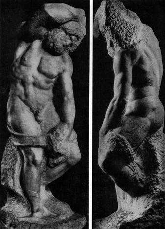 илл.164а,б. Микеланджело. Скованный пленник. Статуя для гробницы папы Юлия II в Риме. Мрамор. Ок. 1513 г. Париж, Лувр.