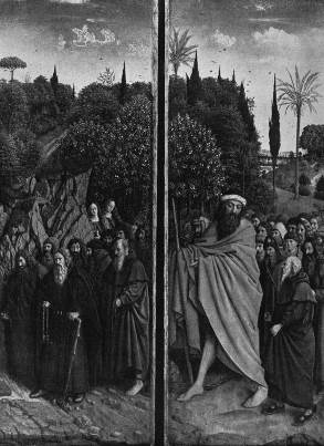 илл.246 Ян ван Эйк. Пилигримы и отшельники. Боковая створка Гентского алтаря. См. илл. 245.