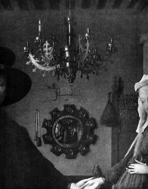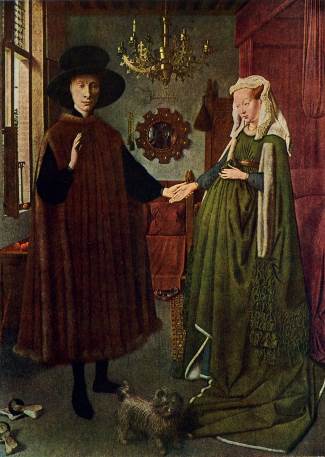 В 1434 г. ван Эйк написал портрет, обычно считающийся изображением купца из Лукки, представителя интересов дома Медичи в Брюгге, Джованни Арнольфини и его жены Джованны (Лондон, Национальная галлерея). Портрет этот не только запечатлевает обоих Арнольфини, но и представляет их в определенной сюжетной и бытовой ситуации: мастер изобразил момент бракосочетания. Супруги находятся в комнате. Джованни держит в руке руку Джованны. Между ними, на противоположной стене помещено зеркало, в котором отражаются двое входящих (один из них, видимо, сам художник).