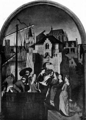 илл.271 Мемлинг. Прибытие св. Урсулы в Кельн. Клеймо ковчежца св. Урсулы. До 1489 г. Брюгге, музей Мемлинга.