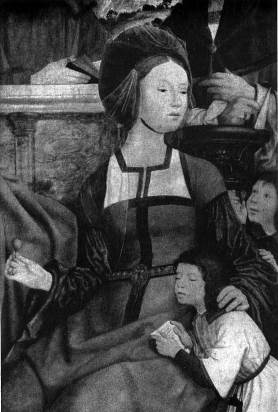 илл.277 Квентин Массейс. Алтарь св. Анны. Фрагмент центральной части (Мария Саломия со своими детьми Иаковом Старшим и Иоанном Богословом). 1507-1509 гг. Брюссель, Музей изящных искусств.