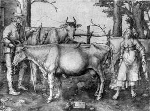Но с особенной силой «концепционная реалистичность» Луки проявилась в одной из его наиболее глубоких работ — гравюре «Коровница» (1510). Натурные впечатления здесь выражены с грубой правдивостью. Но геометрически четкое, ритмизированное расположение коров и сложное подчинение всех деталей системе вертикальных осей приносит в этот лист дух безупречной строгости и соразмерности. Тяжеловесно-внушительной фигуре парня и грубоватой, но не лишенной изящества коровнице придана соответствующая ритмическая среда — в первом случае прямолинейная и четкая, во втором построенная на искривленных формах.