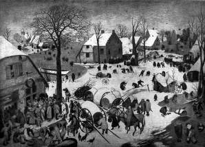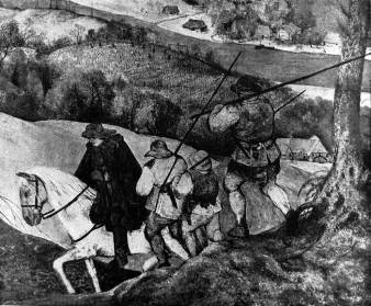 Созданные следом за «Временами года», в 1566 г., картины— «Перепись в Вифлееме» (Брюссель), «Избиение младенцев» (Вена, Музей), «Проповедь Иоанна Крестителя» (Будапешт, Музой) — означали рождение искусства, главной темой которого является жизнь парода не в ее вневременном, как бы общечеловеческом аспекте, а в общественном и конкретно-социальном плане. Все они впечатляют сознанием достоверности происходящего, и евангельский сюжет, по существу, служит только.маскировкой (в «Избиении» изображено нападение испанских солдат на фламандскую деревню).