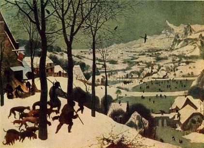 «Сумрачный день» (Вена, Музей) с его рваными, набухшими тучами, медленно разгорающимися красно-коричневыми тонами земли, оживающими голыми ветвями и всепронизывающим весенним сырым ветром; словно потемневшая от зноя «Жатва» (Нью-Йорк, Метрополитен-музей); «Возвращение стад» (Вена, Музей) с медленно наползающей пеленой туч, последним горением рыже-зеленых осенних красок и суровым безмолвием природы; наконец, «Охотники на снегу» (Вена, Музей) —маленький городок, оживленные фигурки конькобежцев на застывших прудах, тихая жизнь, согретая теплом человеческого уюта, — так свершается круговорот природы, меняется ее обличье, ее внутренний ритм .