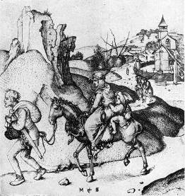 илл.313б Мартин Шонгауэр. Крестьяне, отправляющиеся на рынок. Гравюра на меди. 2-я половина 15 в.