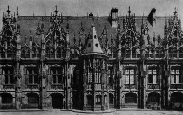 Значительно расширяется гражданское строительство, в котором старые готические формы постепенно вытесняются новыми. Наряду с высокими кровлями, стрельчатыми арками появляются открытые аркады, ясные членения. И все же обилие готической орнаментики сближает эти сооружения с предшествующей Эпохой. Таковы, например, ратуши Компьена и Арраса. К наиболее своебразным сооружениям конца 15 в., отличающимся особым изяществом отделки, относится Дворец Правосудия в Руане.