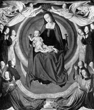 В центре композиции изображена юная нежная Мария с ребенком на руках: у нее простодушное личико миловидной французской девушки, изящен и естествен жест ее рук, поддерживающих младенца. Два хрупких ангела в длинных одеждах коронуют Марию, по сторонам расположились еще двенадцать ангелов, сгруппированные по трое. Каждый ангел — чудесное, почти портретное в своей индивидуальной характеристике изображение ребенка с просветленным нежным и трогательным лицом, а все вместе они, тоненькие, в длинных одеждах, образуют своеобразную гирлянду вокруг Марии. И все же отвлеченность, условность общего замысла, подчеркнутый декоративизм светового эффекта (вокруг Марии расположены светлые круги), беспокойный ритм складок одежд ангелов, составляющих обрамление центральной группы, значительно сильнее связывают триптих из Мулена со старым средневековым мировоззрением, чем произведения Ж. Фуке.
