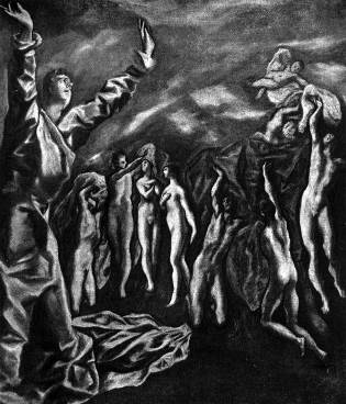 Все острее и настойчивее звучит в творчестве Греко тема гибели мира, божественного возмездия. Показательно его обращение к сцене из Апокалипсиса в полотне «Снятие пятой печати» (Нью-Йорк, Метрополитен-музей). В бездонном пространстве изображены мятущиеся души праведников — типичные для Греко странные бестелесные, безликие существа, судорожно вытянутые обнаженные фигуры которых словно колеблет движение ветра. Среди этого мира теней до грандиозных размеров вырастает на переднем плане фигура коленопреклоненного евангелиста, который, подняв руки, страстно взывает к невидимому агнцу. Эмоциональная выразительность картины с ее резким искажением форм и как бы фосфоресцирующими красками достигает исключительной интенсивности. Та же трагическая тема обреченности и гибели звучит и в других произведениях Греко, казалось бы, не связанных с религиозным сюжетом. В картине «Лаокоон» (ок. 1610 г.; Вашингтон, Национальная галлерея) можно найти некоторые внешние приметы мифологической легенды: изображение Лаокоона и его сыновей, терзаемых змеями, фигуры богов-мстителей, троянского коня, город на дальнем плане. Но все неузнаваемо преображено художником. Боги — те же призрачные существа, что и в других картинах мастера; Лаоокон и его сыновья — христианские мученики, с покорным смирением принимающие божественную кару. Их тела совершенно нереального пепельно-сиреневого оттенка лишены силы, у них нет точек опоры, жесты вялы, бессознательны, и лишь неукротимый огонь веры освещает обращенные к небу лица. Олицетворение гибнущей Трои — это образ Толедо, изображение которого нередко составляло фон многих картин Греко. Художник запечатлел достаточно точно некоторые архитектурные памятники древнего города. Однако его привлекала не столько конкретная передача облика Толедо, сколько, возможно, создание более сложного, обобщенного образа фантастически прекрасного, возникающего в виде тревожного смутного миража города-мира. Глубоким трагизмом овеян этот волновавший Греко образ в его великолепном пейзаже «Вид Толедо» (1610—1614; Нью-Йорк, Метрополитен-музей). Безжизненный, как бы оцепеневший, озаренный зловещим зеленоватым светом вспыхивающих зарниц, город, как призрачное видение, возникает на сине-свинцовом в клубящихся облаках небе.
