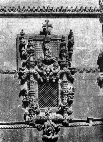 В начале 16 в. средневековые сооружения расширялись и украшались новыми пристройками. Архитектор Бойтак (ум. в 1510 г.) богато оформил внутренний двор средневекового монастыря в Баталье. В том же монастыре Бойтак и Матвиш Фернандиш (умер в 1515 г.) создали роскошную так называемую Незаконченную капеллу. В Томаре, в монастыре св. Креста, к романской ротонде тамплиеров зодчим Диогу ди Арруда, работавшим в 1508 —1531 гг., был пристроен новый неф — один из самых выразительных памятников мануэлино. Это двухэтажное здание с выступающими по углам северного фасада подобиями контрфорсов. Гладкая поверхность массивных стен оттеняет сложное убранство окон, ограды кровли и боковых выступов. У основания контрфорсов каменная резьба в виде переплетающихся водорослей переходит как бы в нагроможение кораллов, которые образуют выше прихотливый силуэт башенных завершений. Совершенно необычно оформление розы второго этажа северного фасада. В обрамлении круглого оконного проема изображено некое подобие раздуваемого ветром паруса, сдерживаемого перехватами морского каната. Еще более причудлив декор помещенного в центре нижнего этажа прямоугольного окна. Наросты кораллов, извивающиеся водоросли, орнамент из листьев пробкового дуба, якорные цепи, странные, трудно объяснимые формы, словно навеянные таинственным миром океана,— все это, перевязанное запутанными, взбухающими узлами каната, создает грубовато-сочное словно охваченное внутренним напряжением обрамление окна. Не считаясь с тектоникой здания, его пересекают горизонтальные тяги то в виде гладких, то с нанизанными на них поплавками мощных канатов.